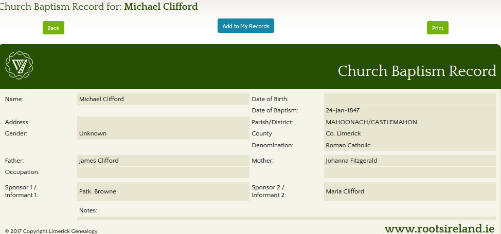 - 1847 – Michael was baptized on Jan 24, 1847. Sponsors Maria Clifford and Patrick Brown