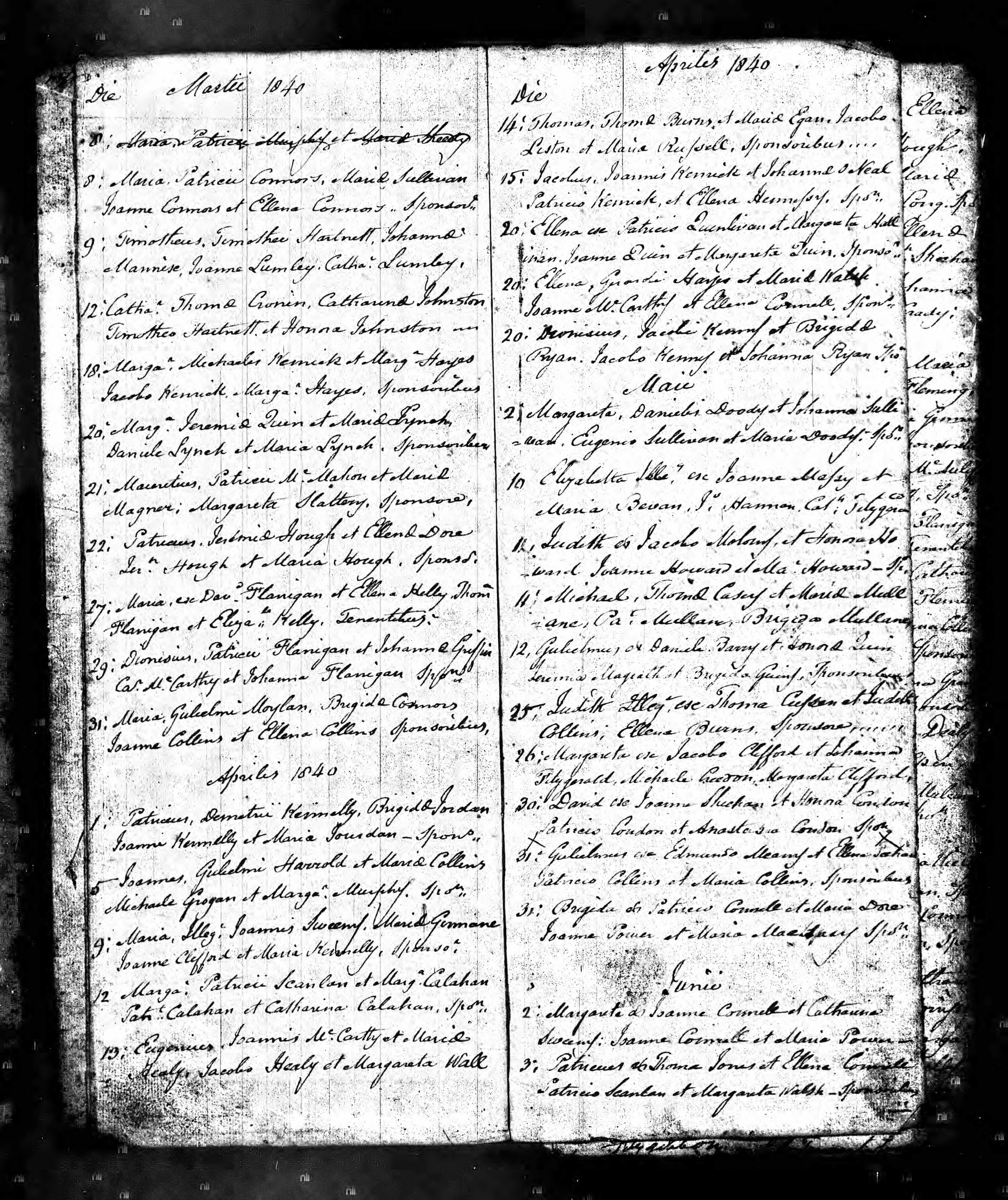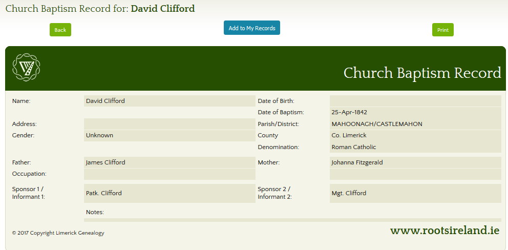 - 1842 – David baptised 25 April, sponsors were Patrick Clifford and Margaret Clifford