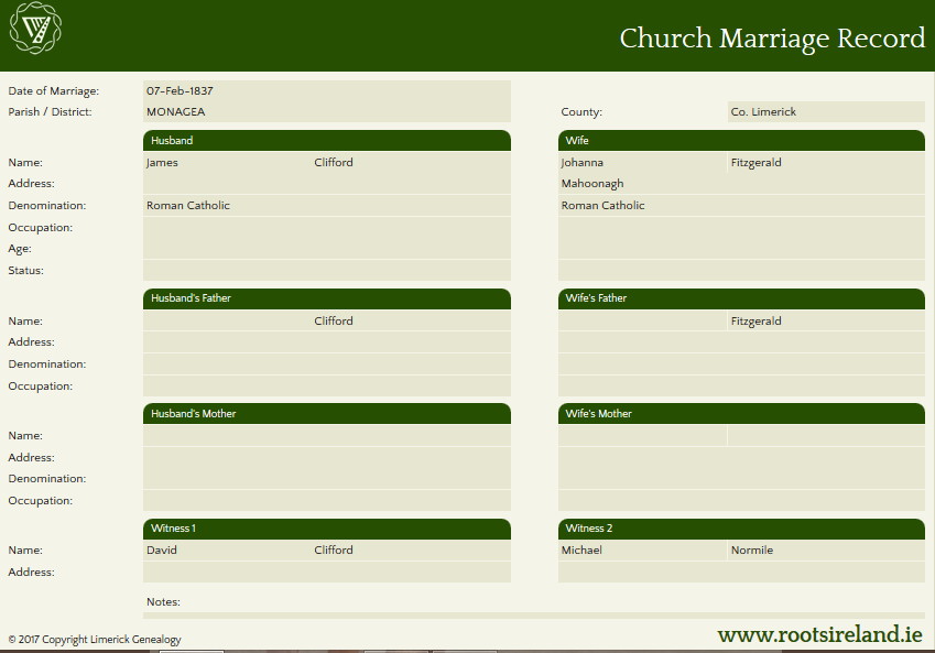 But what we do know is that on February 7, 1837, James Clifford and Johanna Fitzgerald stood before witnesses — David Clifford and Michael Normile — and promised their futures to each other.
