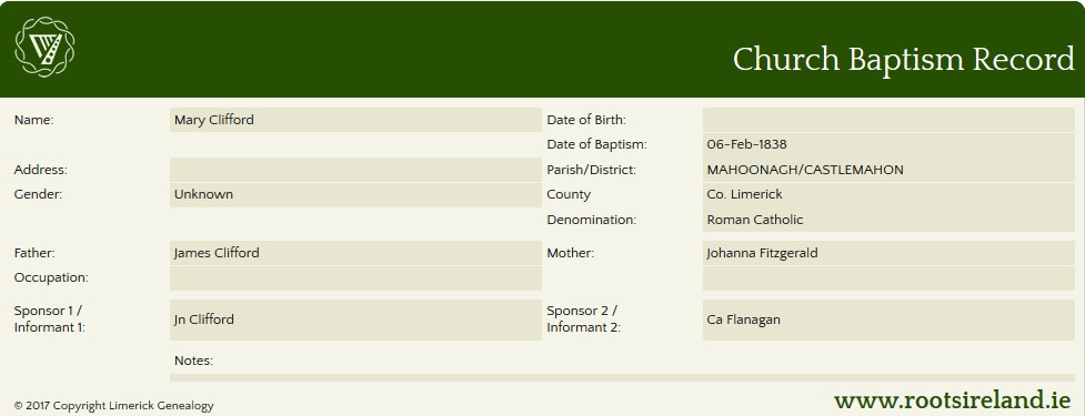 - 1838 – Mary baptized 6 Feb, sponsors were John Clifford and Catherine Flanagan