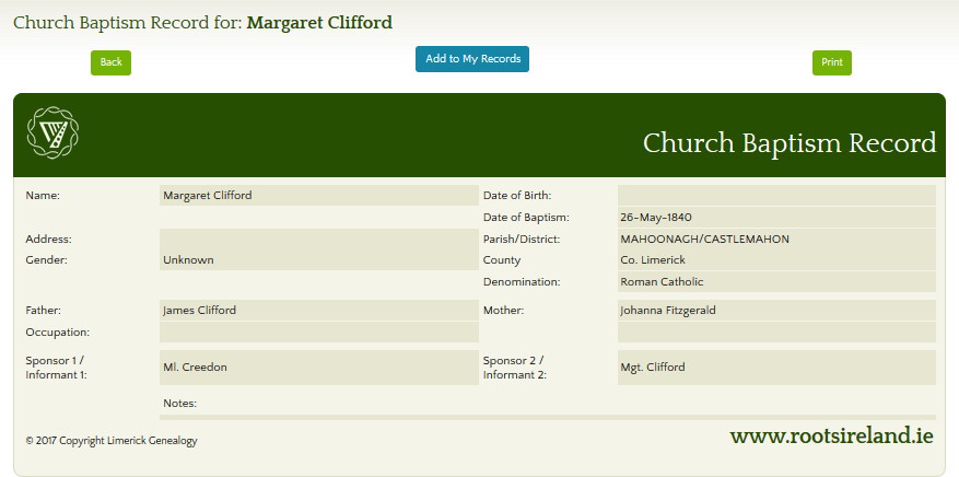 - 1840 -Margaret baptised 26 May, sponsors were Michael Creedon and Mgt Clifford. Margaret married John Mulcahy. (see Clifford, Margaret 1840 – 1895 & Mulcahy, John 1833 – 1885) She died 1895, aged 45
