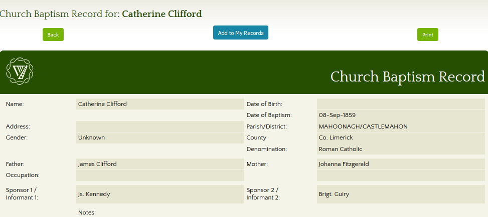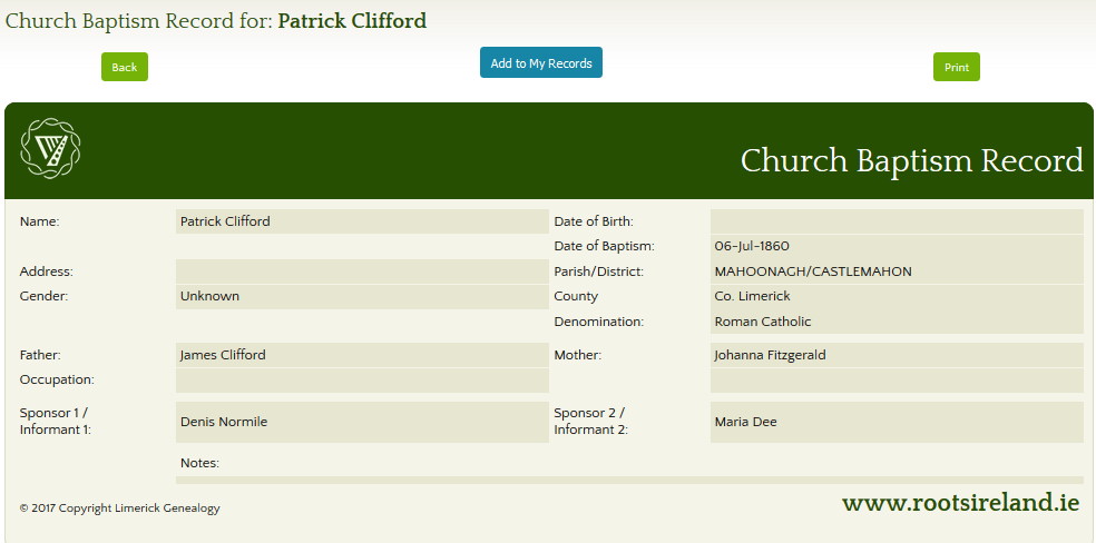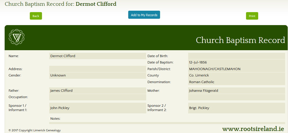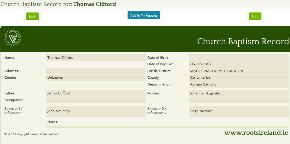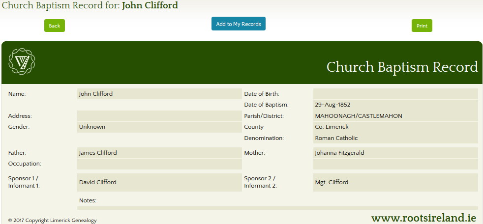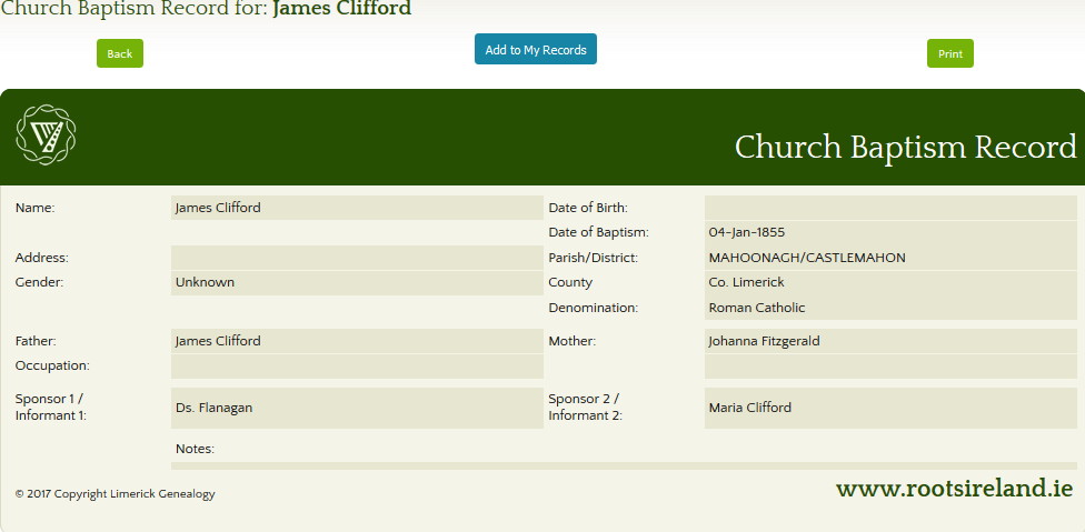 - 1855 – James Clifford was baptized on 4 Jan 1855. The sponsors were Denis Flanagan and Maria Clifford.