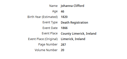 James Clifford died in 1865 in Newcastle West, Limerick, Ireland, at the age of 50.