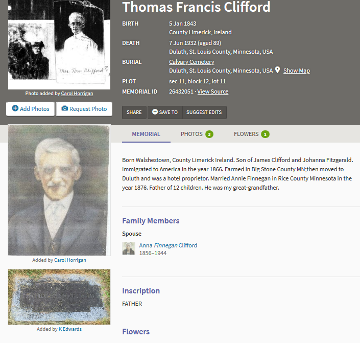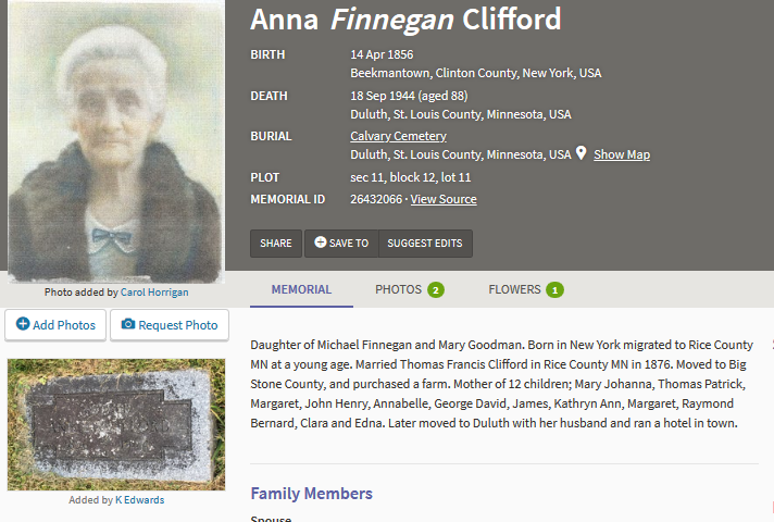 In 1944, as the autumn leaves whispered their final goodbyes, Anne’s journey reached its conclusion, her spirit finding rest in the comforting embrace of their son Raymond, at 407 East 5th St., Duluth, St. Louis, MN. And though their physical presence may have faded from this world, the legacy of Thomas and Anne Clifford lives on, woven into the fabric of their family’s history. https://www.findagrave.com/memorial/26432066/anna_clifford