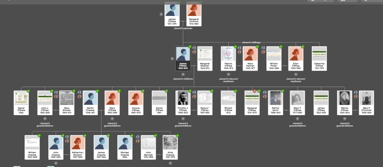 Margaret O’Shea, widow of James O’Shea, farmer died on March 20, 1890 and Martin Chawke was present at the time of her death – I am assuming that Margaret was his wife’s grandmother.